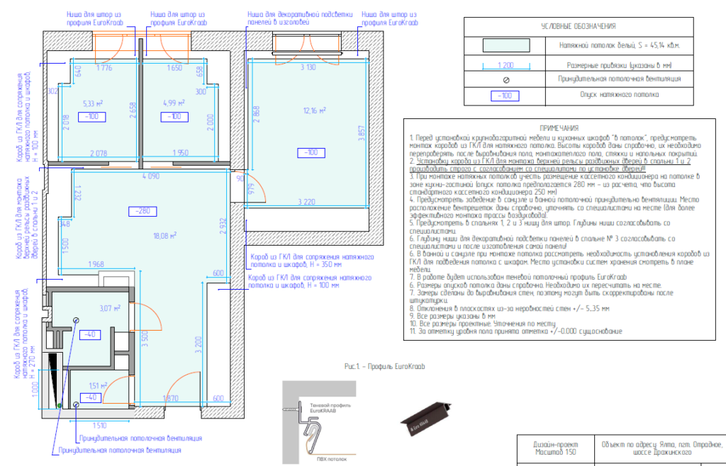 Обязательным разделом дизайн-проекта является план покрытия потолков, на котором отмечается вид потолочного покрытия, его площадь, указываются нюансы, которые необходимо предусмотреть при монтаже (ниши, закладные, скрытые подсветки и др).