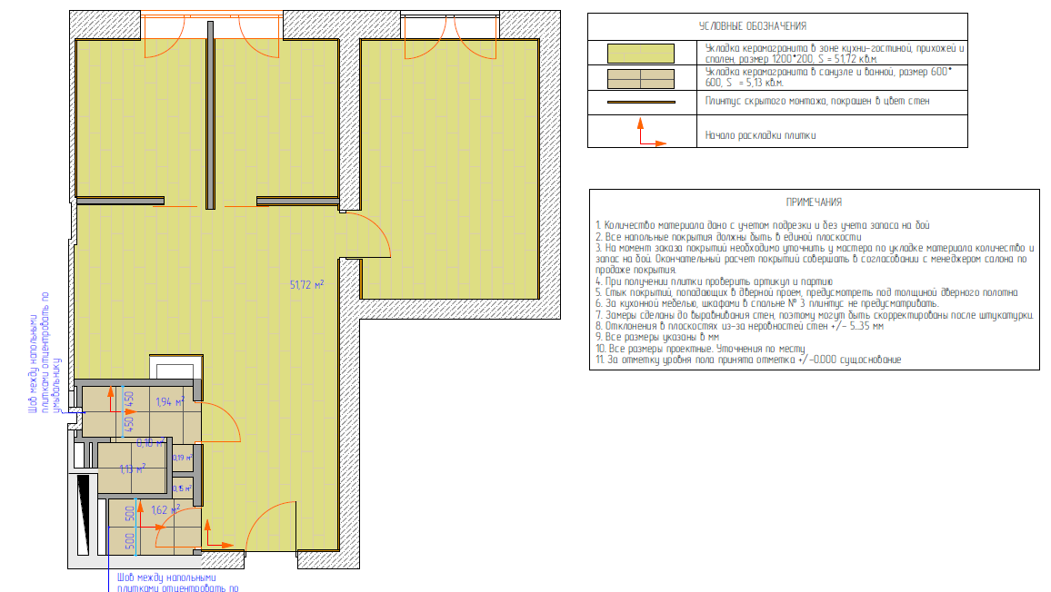 План напольных покрытий дизайн-проекта дает четкие представления и для мастеров, и для заказчика, в какой комнате какое покрытие будет применено, откуда начинается его раскладка.