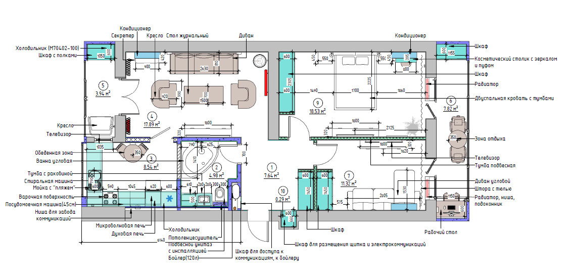 Выполнив необходимые замеры, обозначив на плане дизайн-проекта перегородки и конструкции, подлежащие демонтажу или установке, мы приступаем к плану экспликации и расстановки мебели.