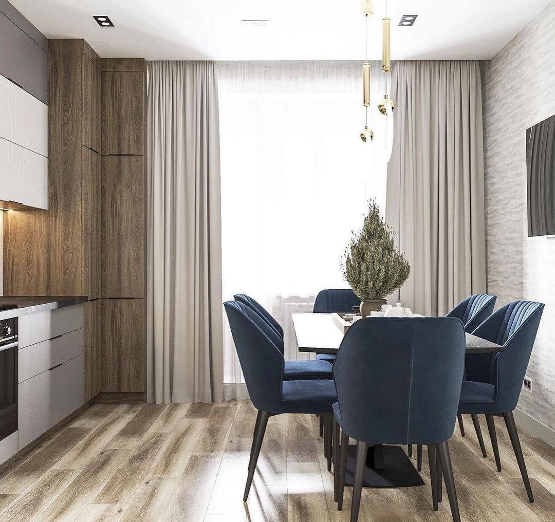 Если на кухне планируется остров или полуостров, комфортное расстояние вокруг него будет от 100 до 150 см.