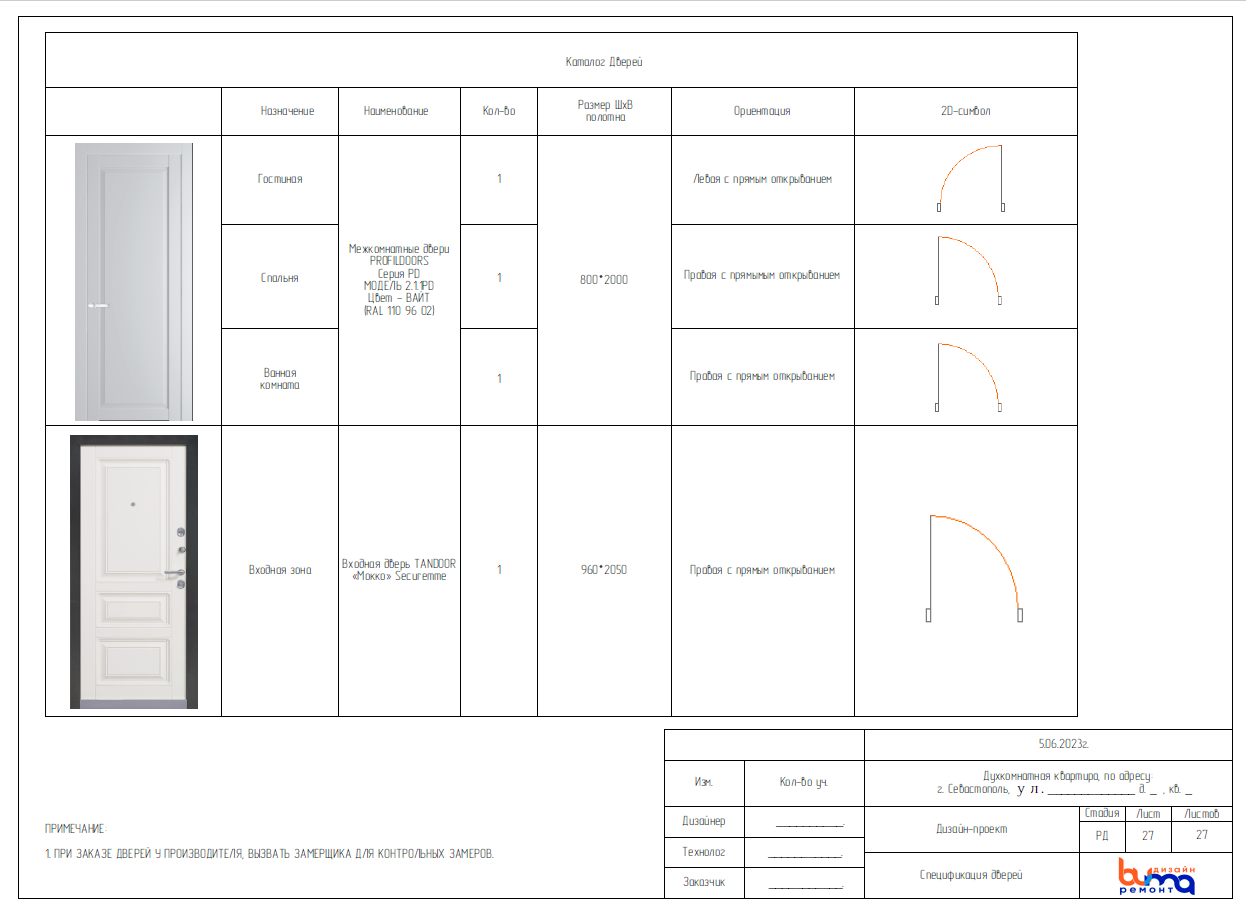 «Спецификация дверей», отражающая основные характеристики дверных конструкций. Этот план необходим для исключения ошибок в процессе реализации проекта и дальнейшего пользования дверями.