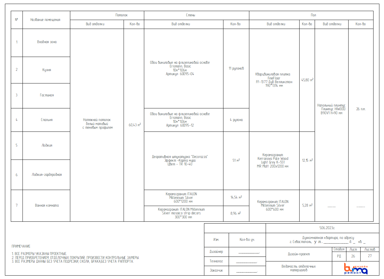 «Ведомость отделочных материалов», в которой отмечены все чистовые материалы с артикулами. Это позволит не только купить качественные материалы, но и избежать лишних затрат, т.к. в плане указано и точное количество закупаемых материалов. Также это значительно облегчит процесс выбора из огромного количества видов и оттенков плитки, обоев и других материалов.